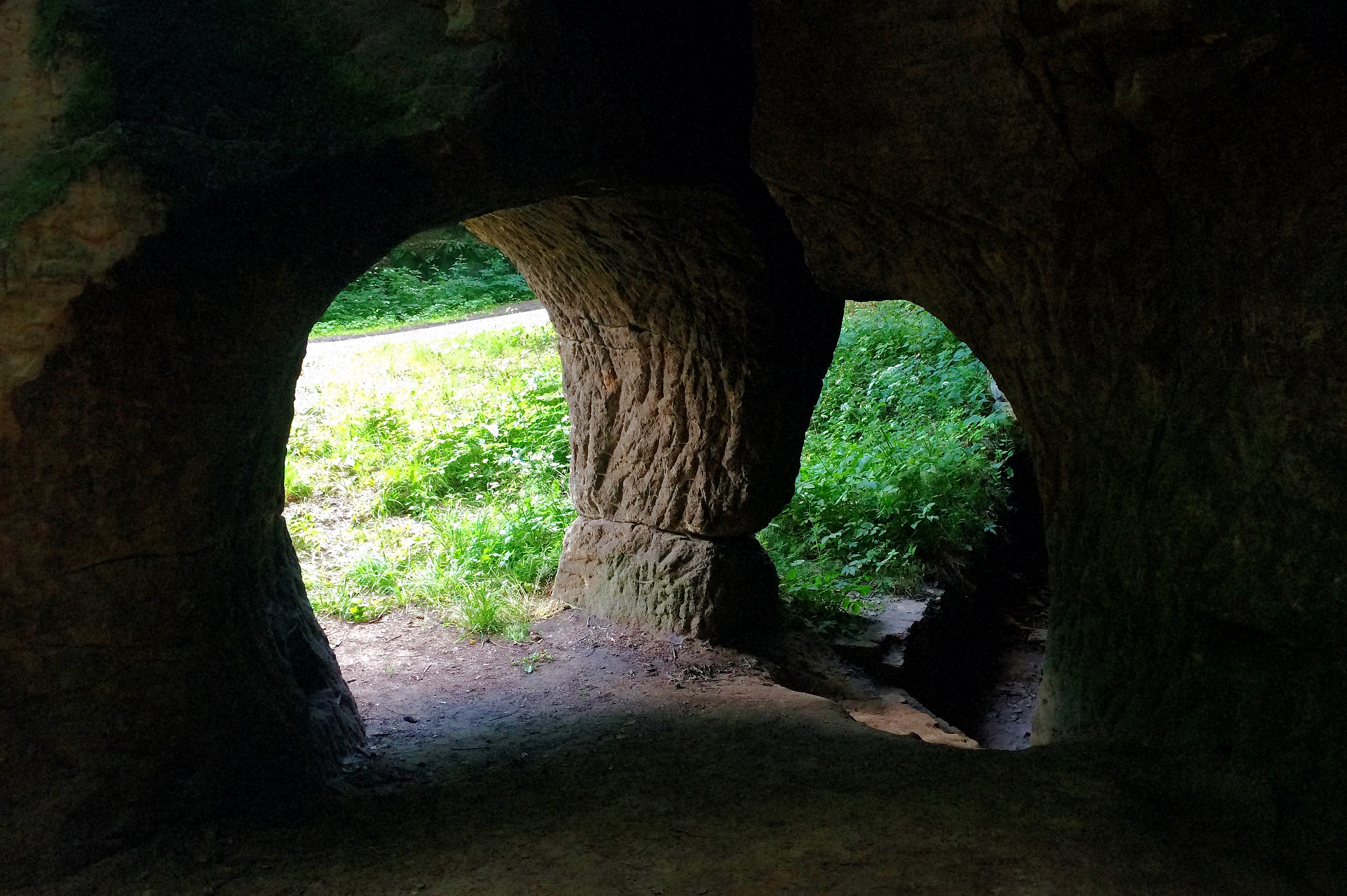 A second underground sandstone quarry is located about 250 meters west of the former Wellnitzer mirror factory at the point where the road leaves the valley and begins to climb towards Svitava . This break, which is called Pustý kostel (desert church), although somewhat smaller, but has been able to preserve its original character almost entirely, because he has suffered from later internals, but little. From an oval room, surrounded on three sides by rocky vaults, you descend into the dark cool rooms of the cave, whose floor is about 1.5 to 2 m below the level of the environment. The gradually lowering ceiling is supported by 16 rock pillars left standing, in places dripping water trickled through it by the cracks of the rock mass. Here, too, remains of brick walls dating back to the time when part of these underground halls had been prepared for storage. On a small boulder to the right of the entrance to the cave is a crucifixion carved in the rock by an unknown local artist.