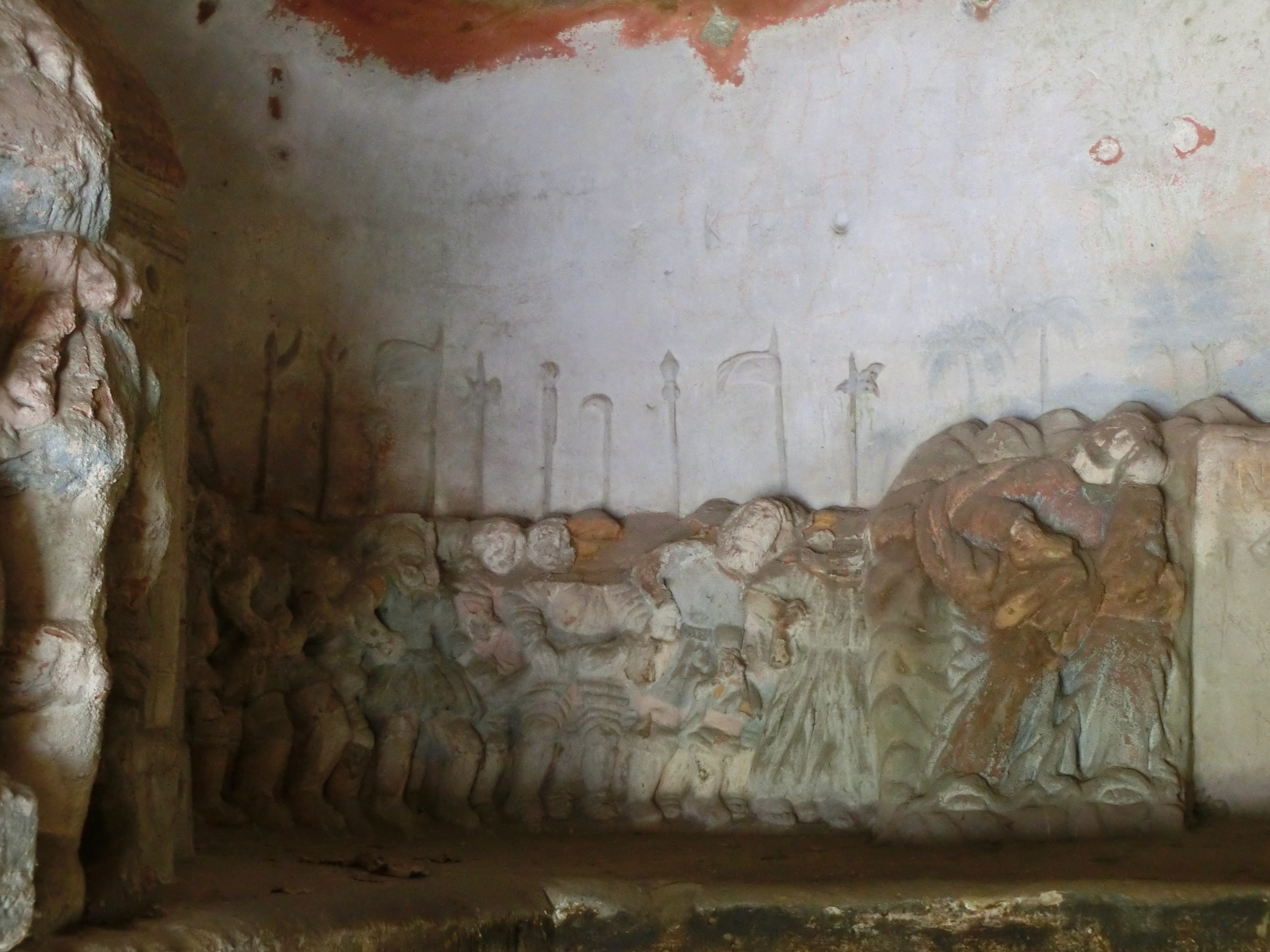 The interior of this elongated chapel is divided into three smaller rooms. The access leads into the middle room through a wide entrance portal to which originally led some spilled in the road construction stages. Directly opposite the entrance is an altar with a niche for the body of Christ, which was carried over in a procession from the Velenice church at Easter. In the adjoining rooms, illuminated by two windows, there are folk relief paintings from the Passion Cycle with remnants of a painterly decoration still visible today. Some of the pictures illustrate the last moments of Jesus Christ's life, from his prayers on the Mount of Olives to his crucifixion on Golgotha.