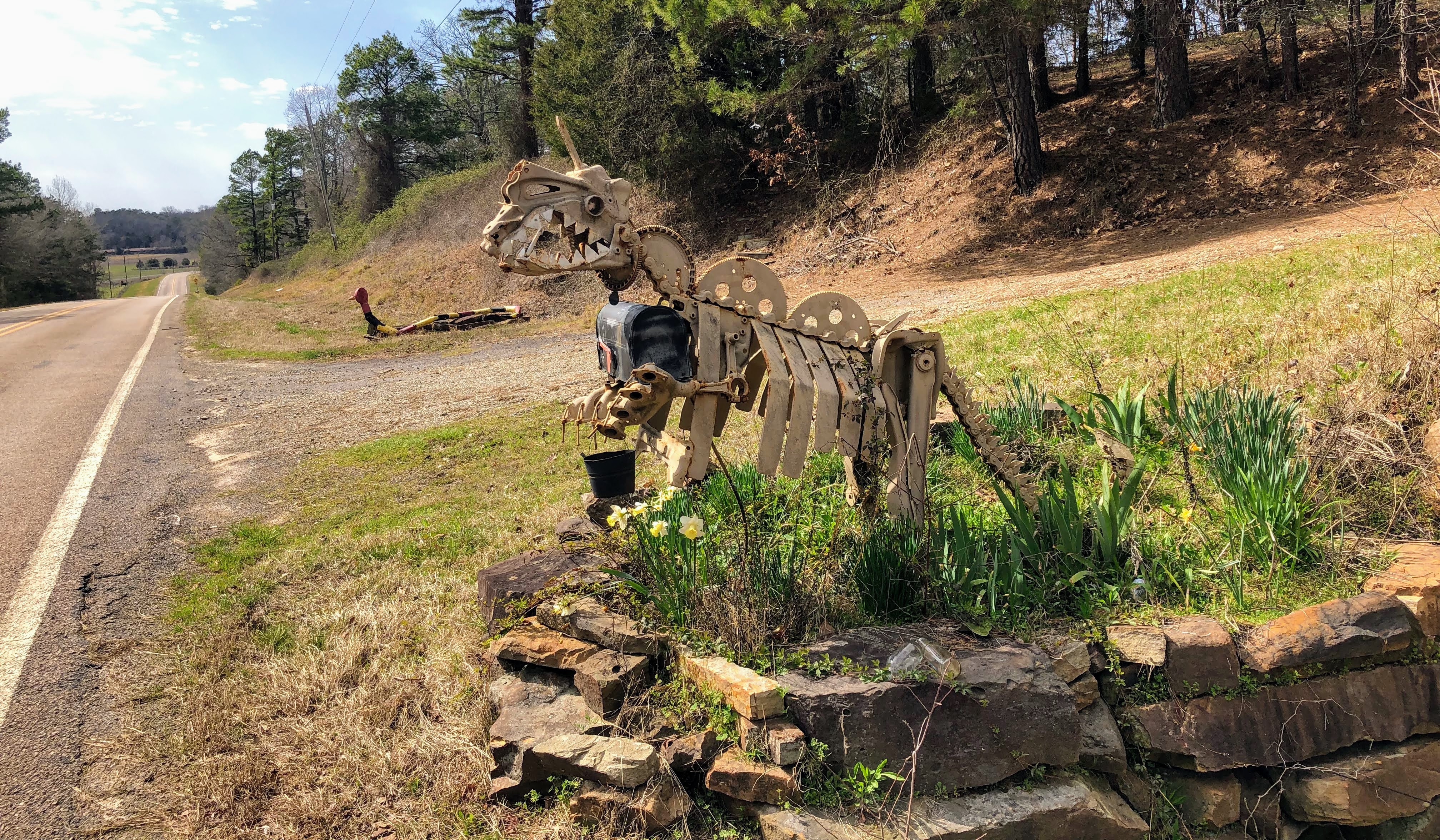 Roadside sculptures in Lamar, AR, the stuff I always hoped to find by chance. I don't know the name of the artist and I couldn't find any information online. Large metal objects like dinosaurs, a bear, a cock, a snake, a flower are placed along the road in a private property. More objects were visible from the road.