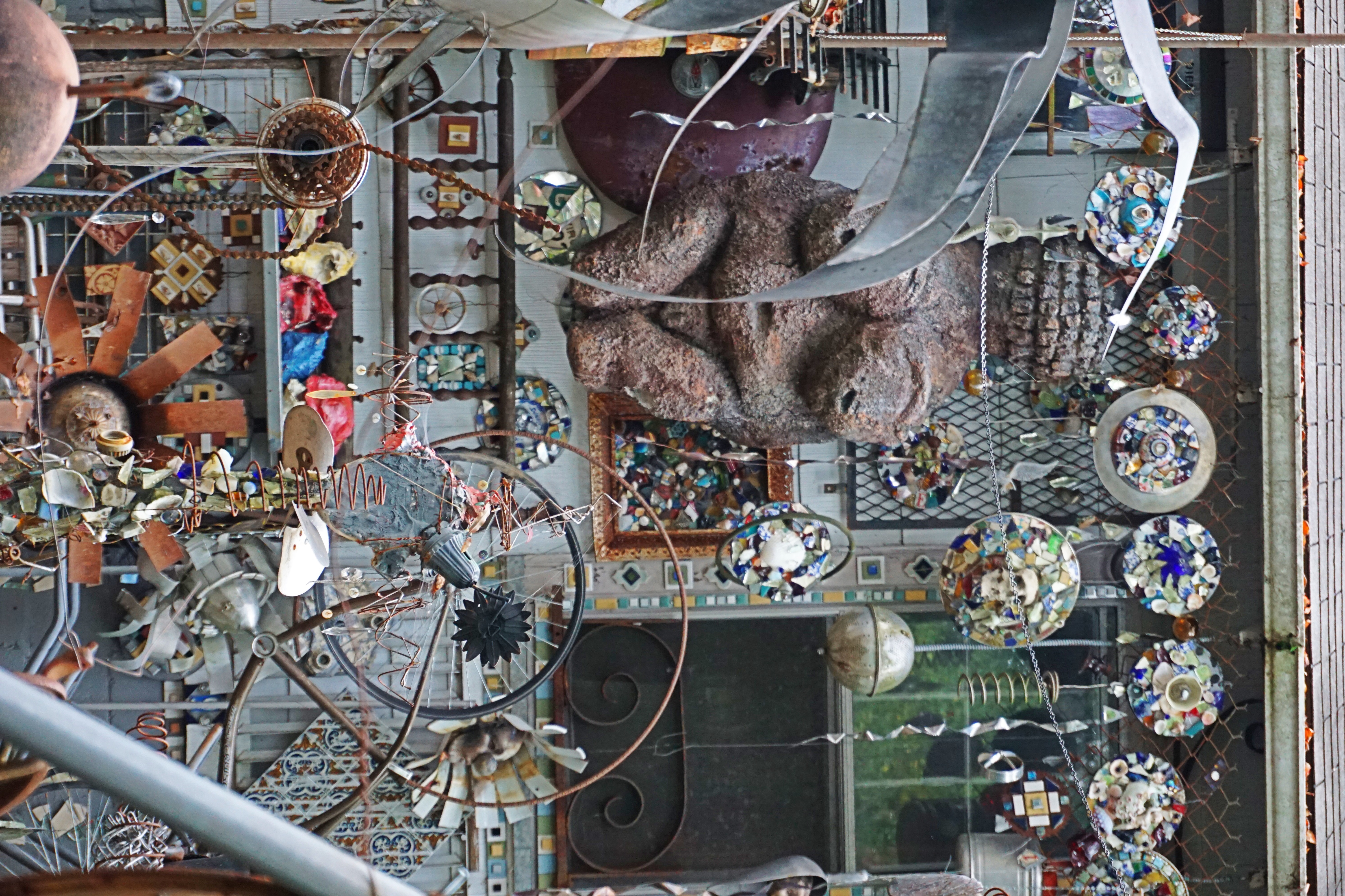 "Known as “Vanadu,” Clarke Bedford’s peculiar art house is filled with a large collection of antiques, junk, and historical objects. Throughout the high-density cluster of sculptures and mosaics you’ll find a horned wooden owl, a black and white striped cone, a skull, a statue of John Locke, a German language globe stuffed inside a rusted horn, and a woman’s face covered in glass and colored fragments of junk.