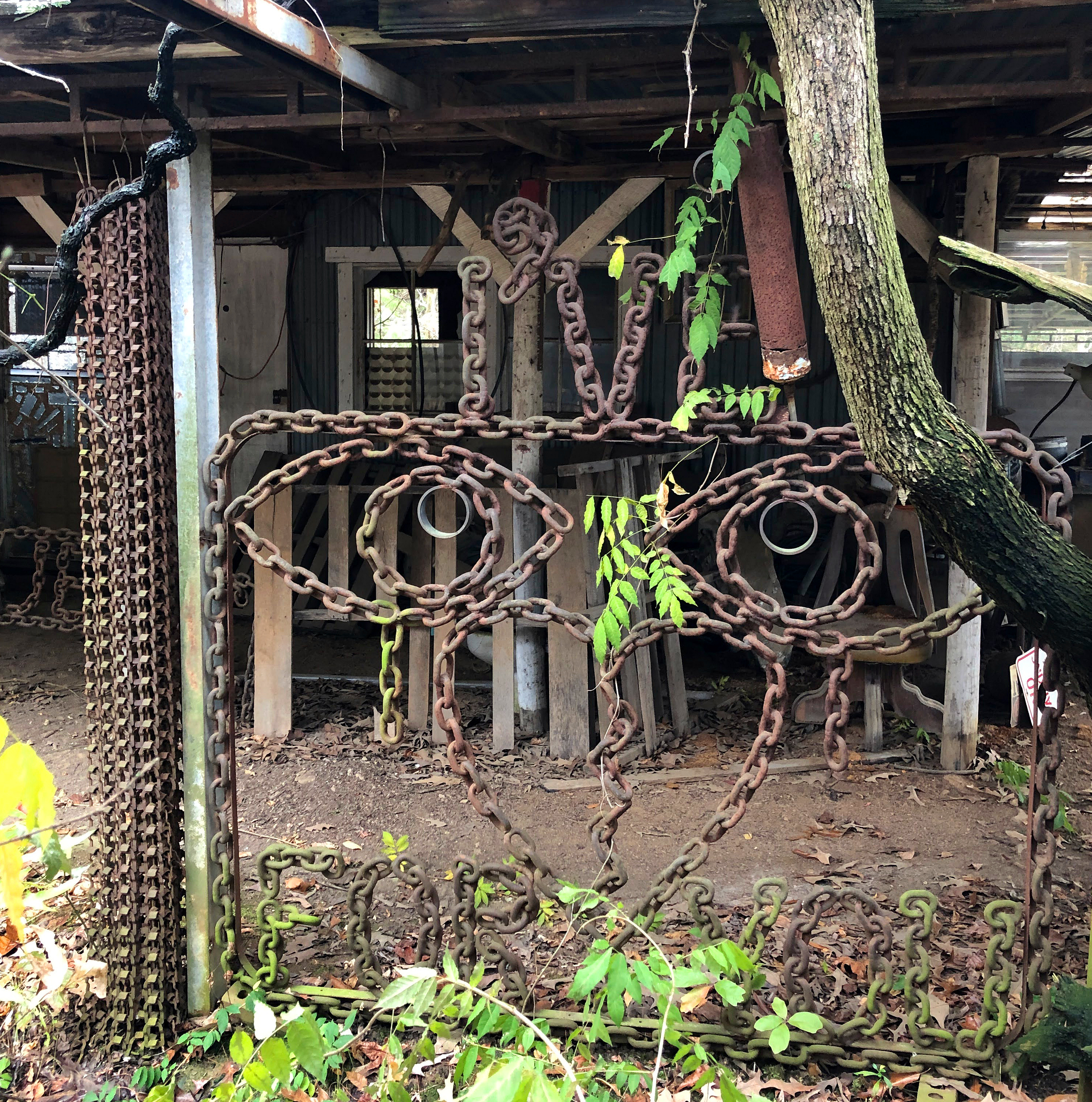 "By day Robert Wells (1949-2012) safely removes dangerous asbestos from construction, demolition and renovation sites; but nights and weekends he creates art objects of welded chains, railroad spikes and you-name-its. This is Robert Wells and that is some of his art, which you will see if you will but look east as you travel along highway 71 through Grannis. That's about midway between DeQueen and Mena.