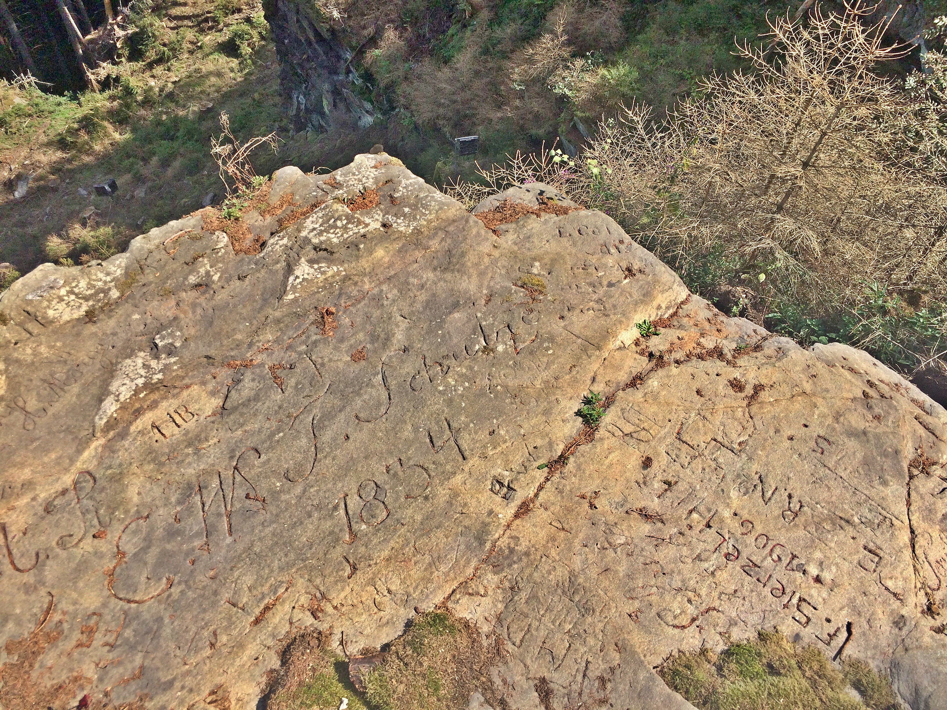 Fels, oberhalb des Unterbecken, mit Gravierungen von ca. 1835 bis 1935