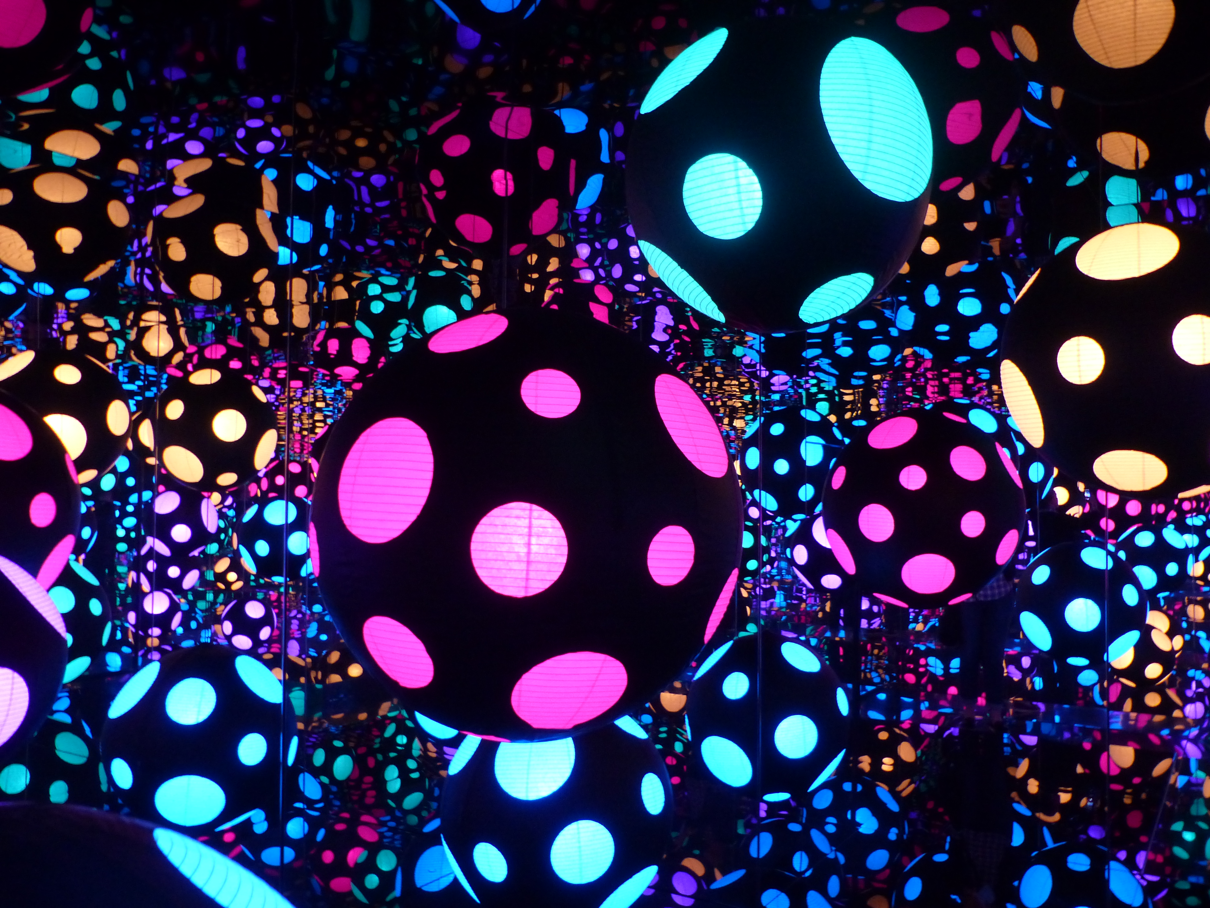 Yayoi Kusama’s artwork, Infinity Mirrored Room—My Heart is Dancing into the Universe (2018) is on view permanently at Crystal Bridges. The room itself is small and filled with mirrors and paper lanterns that have dots that change color. This effect makes it appear like the dots expand forever into the universe.